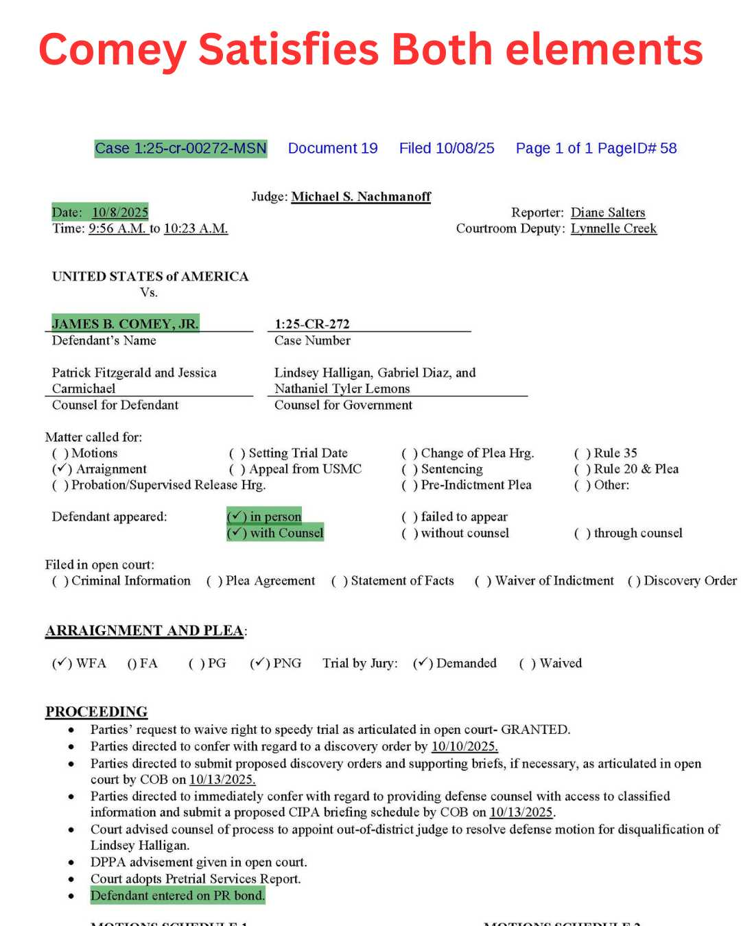 10/8/25 (9:56–10:23 AM): Comey appears in person at the Alexandria federal courthouse for arraignment, with counsel, on that indictment. The minutes reflect a standard arraignment: plea entered, PR bond, jury trial demanded.