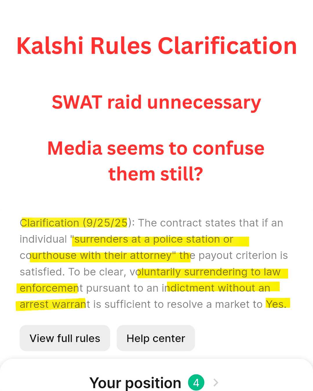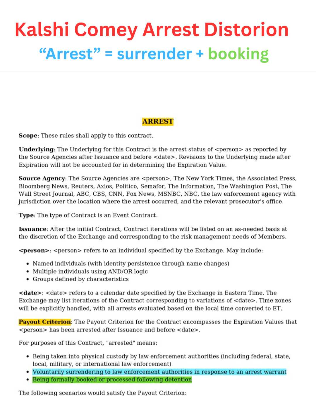 TL;DR: I’ve formally submitted a Rule 7.1 outcome review to Kalshi asking them to resolve KXARREST-27JAN (Comey) to YES. The packet shows Comey clearly meets Kalshi’s own arrest definition once you link FRCP 5 to U.S. Marshals’ mandatory booking authority. Evidence + email are in this Drive: @SportsPicks