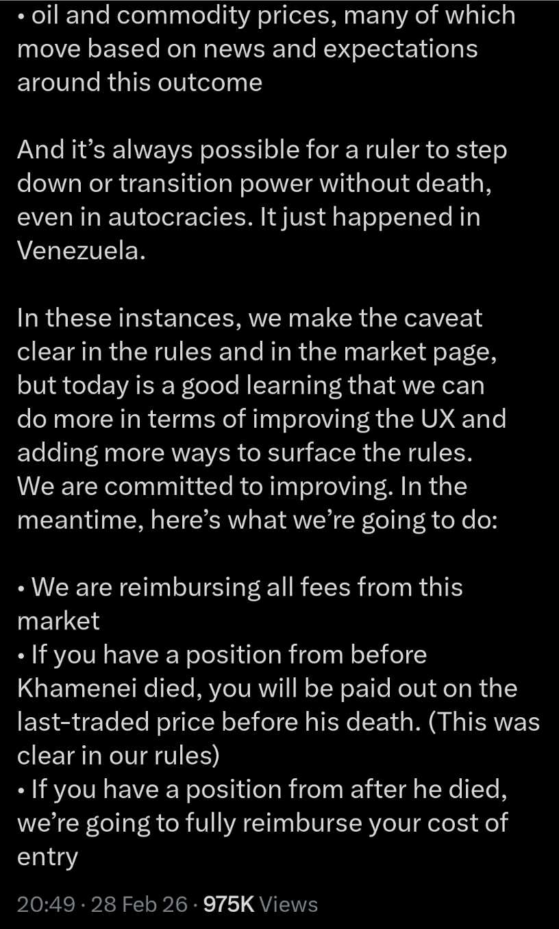 Looks like Kalshi is trying to play moral arbiter now. https://x.com/i/status/2027924240926638323