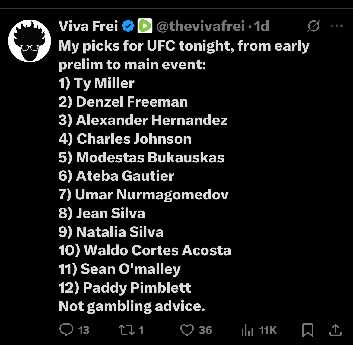 Viva went 8-4, missed on the main event, but I was like 6-9 with all my R1 KO & U1.5 round props. Looks like the Lewis/Acosta fight was finished O1.5 rounds.